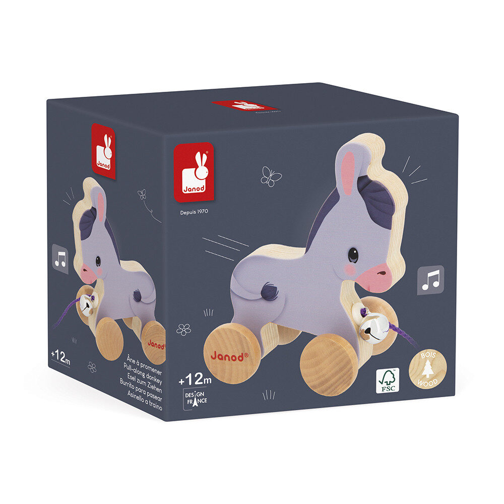 Un pelage clair, des oreilles déjà grandes : craquez pour ce petit âne à promener pour votre bébé ! Idéal pour accompagner les premiers pas comme les grandes aventures, il convient aux petits dès l’âge de 12 mois. Avec son jouet à tirer, bébé se promène en bonne compagnie et développe son imagination. C’est un jouet d’éveil parfait pour stimuler la motricité en douceur, qui invite toute la famille à une balade champêtre à la ferme. Avec sa jolie clochette à l’avant, ce petit âne en bois tintera joyeusement en roulant. Un petit âne est généralement curieux et joueur, mais aussi tenace et patient … Des points communs avec votre bambin, peut-être ? En tout cas, une chose est sûre, il nous fait craquer avec son regard doux et ses belles roues en bois ! De l’écurie aux verts pâturages, ce jouet à promener n’attend que bébé pour une sortie. Composé de bois issu de forêts gérées durablement, certifié FSC™, ce jouet premier âge possède une ficelle de 50 cm de long. Allez, on sait qu’il sera son jouet préféré !