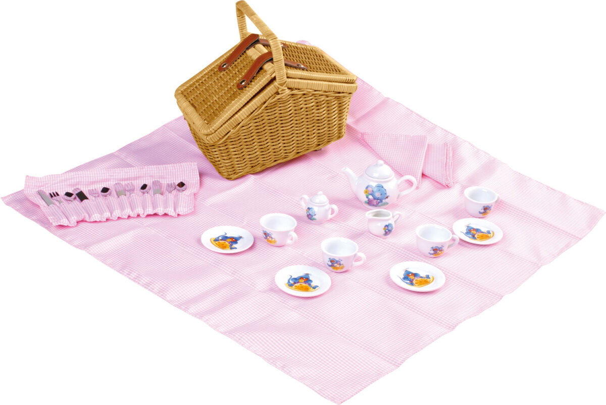Que ce soit au jardin ou au parc, la vaisselle en porcelaine à motif enfantin égayera toute sortie! Le set ne laisse rien à désirer : quatre assiettes, tasses, soucoupes, fourchettes, cuillères et couteaux ainsi qu´une cafetière, une sucrière et un pot à lait sont inclus! Une couverture rose pour tous les pique-niqueurs complète le jeu de rôle! L’excursion avec poupée, peluche et cie peut commencer.