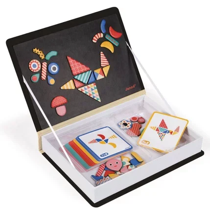 Jeu éducatif magnétique en carton sur le thème du tangram. Composé de 43 magnets et de 30 cartes. Une fois le livre ouvert, le but du jeu est de recomposer sur la scène le tangram indiqué sur la carte à l’aide des magnets.