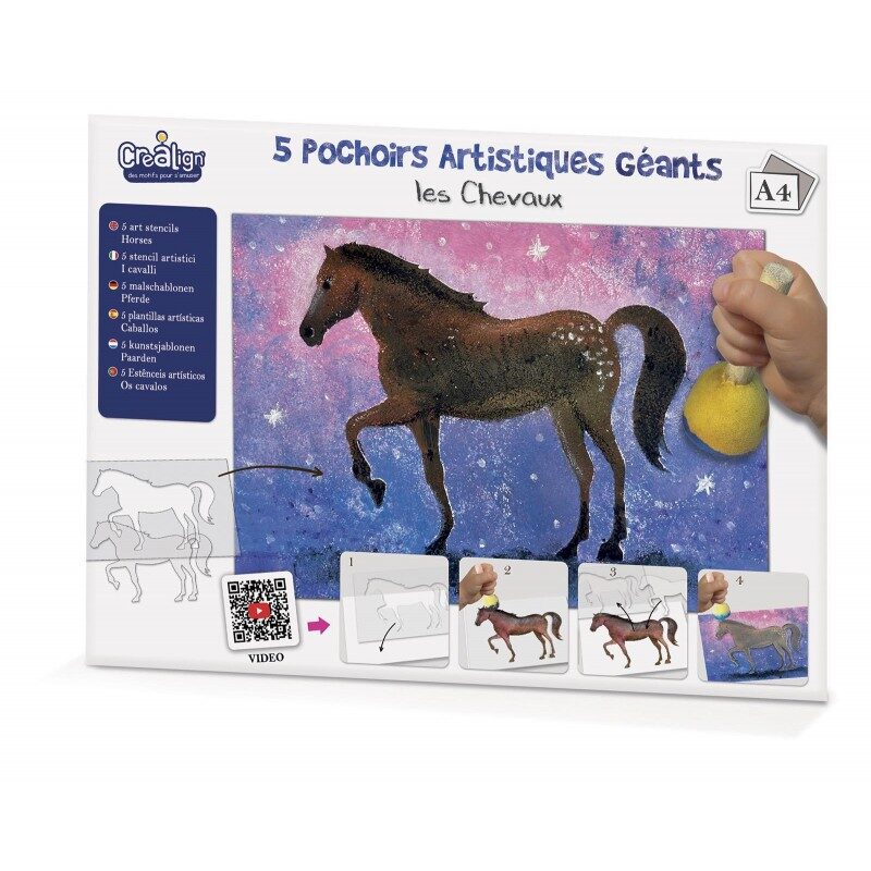 Une pochette contenant 10 pochoirs pour réaliser 5 dessins de chevaux différents.