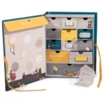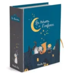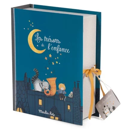 Coffret à trésors pour ranger dans chacun des tiroirs toutes les douceurs de l’enfance. Reprend tous les personnages de la gamme dans leur univers de la nuit. Fermeture avec liens et petite cartonnette en forme d’enveloppe pour y écrire son nom.