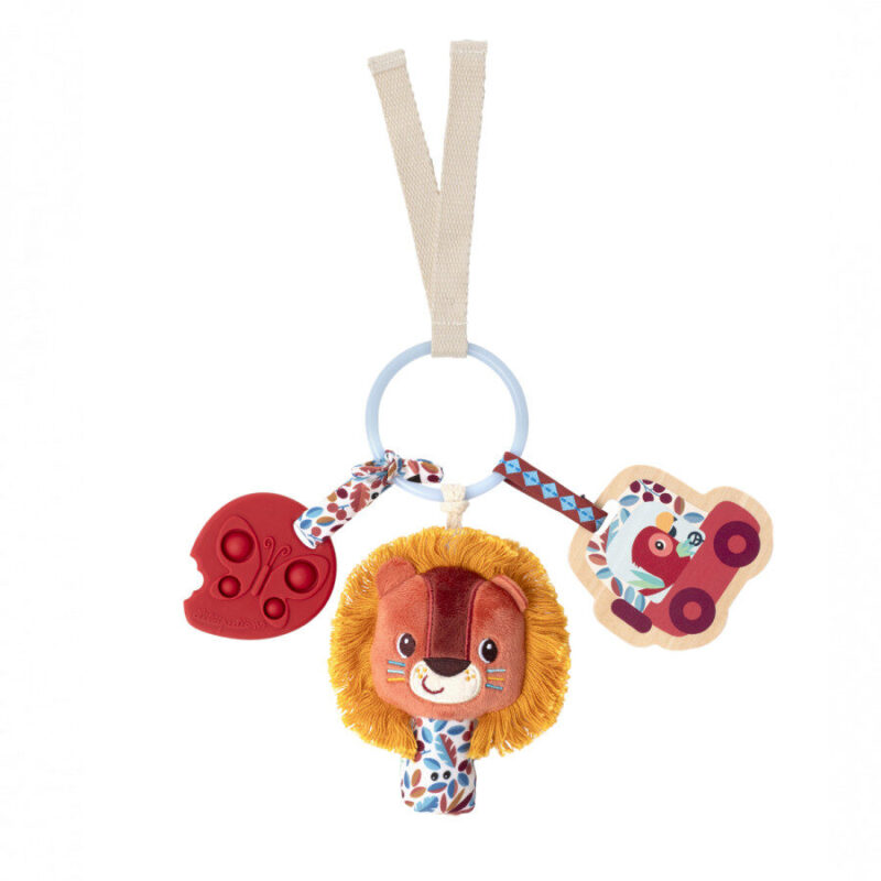 Divertissez bébé en promenade ! Sur le thème Safari, ce trousseau d’activités Jack le lion est adapté aux petits dès l’âge de 3 mois. S’ils adorent les trousseaux de clés des adultes, qui produisent des sons captivants et sont faciles à manipuler, les bébés vont adorer ce trousseau et ses 3 jouets d’éveils conçus rien que pour eux. D’abord, un anneau de dentition en forme de feuille en silicone. Idéal à mordiller pour soulager les poussées dentaires, il est de couleur rouge et propose également une activité de popping fascinante et relaxante. Ensuite, un joli hochet à faire tinter sous forme de peluche lion. Pour finir, un joyeux perroquet est au volant de son bolide rouge … Il cache un miroir au verso ! Ce jouet d’éveil peut facilement être suspendu près de bébé pour toujours être à sa portée et l’amuser où qu’il soit. Grâce à lui, bébé développe sa motricité fine, son acuité visuelle et auditive, et explore par le toucher. Les couleurs chaleureuses et les motifs feuilles rappellent la jungle où vit notre ami Jack le lion. Les coloris vifs, la variété des matières et des activités ainsi que son format font de ce jouet premier âge un indispensable à emporter partout ! Ce jouet d’activités Lilliputiens mesure 25×20 cm et se compose de polyester, de silicone, de bois et de plastique. Il est lavable en surface uniquement.