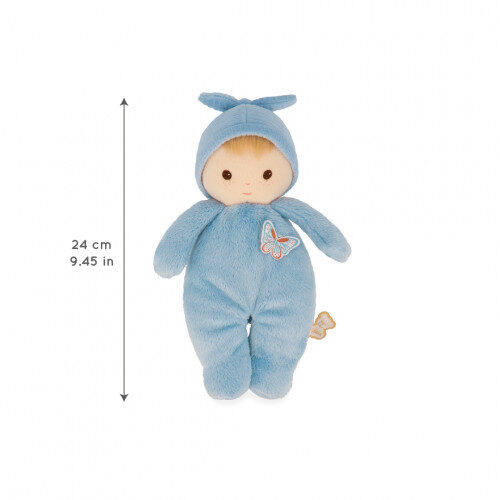Bébé Lin est prêt pour l’aventure d’une vie ! Voilà un poupon en tissu charmant et moelleux, idéal comme doudou ou première poupée pour bébé. Cet adorable poupon blond de 24 cm se différencie par son corps bleu et ses jolis yeux marrons. Composé de micro-velours extra-doux, de velours côtelé, et rembourré avec du polyester recyclé, ce poupon en tissu offre une texture moelleuse qui invite à toujours plus de tendres câlins. Inspiré par la fleur de lin, synonyme d’élégance, il est le cadeau idéal pour exprimer pureté, minimalisme et durabilité. Le lin est réputé pour sa résistance et sa longévité, à l’image du lien fort et durable qui unit bébé à ses parents. Le torse de cette petite poupée est orné d’un papillon délicat, qui rappelle la légèreté et la grâce des fleurs : un détail vraiment poétique. L’étiquette en forme de papillon est une invitation à développer la dextérité et la curiosité sensorielle de bébé. Chaque câlin avec Bébé Lin stimule les sens en douceur et encourage le développement tactile des jeunes enfants. Son adorable bonnet noué est un élément de plus à explorer.