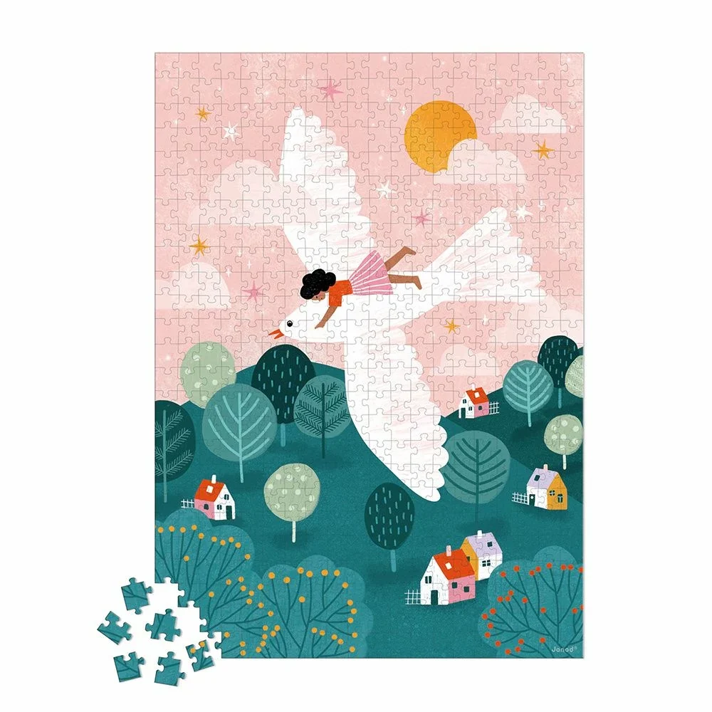 Envolez-vous pour une belle aventure avec notre charmante colombe et son amie ! Imaginez un monde où les oiseaux et les humains partagent une amitié profonde et sincère. C’est l’histoire que raconte notre puzzle de 500 pièces pour les enfants dès 8 ans comme pour les grands. Chaque pièce de ce puzzle est un moment de détente et d’apaisement. En assemblant les pièces du puzzle, vous découvrez peu à peu une scène touchante : une petite fille volant dans le ciel avec une colombe aux ailes déployées. Sous leurs yeux, défile un paysage bucolique aux couleurs marquées. Les maisonnettes réparties dans la campagne côtoient les arbres bleu-vert, aux traits presque naïfs. Le ciel rose contraste avec cet environnement. Une fois terminé, le puzzle peut être encadré et accroché au mur, transformant votre salon en une véritable galerie d’art. Alors, êtes-vous prêt à vous envoler loin du stress quotidien ?